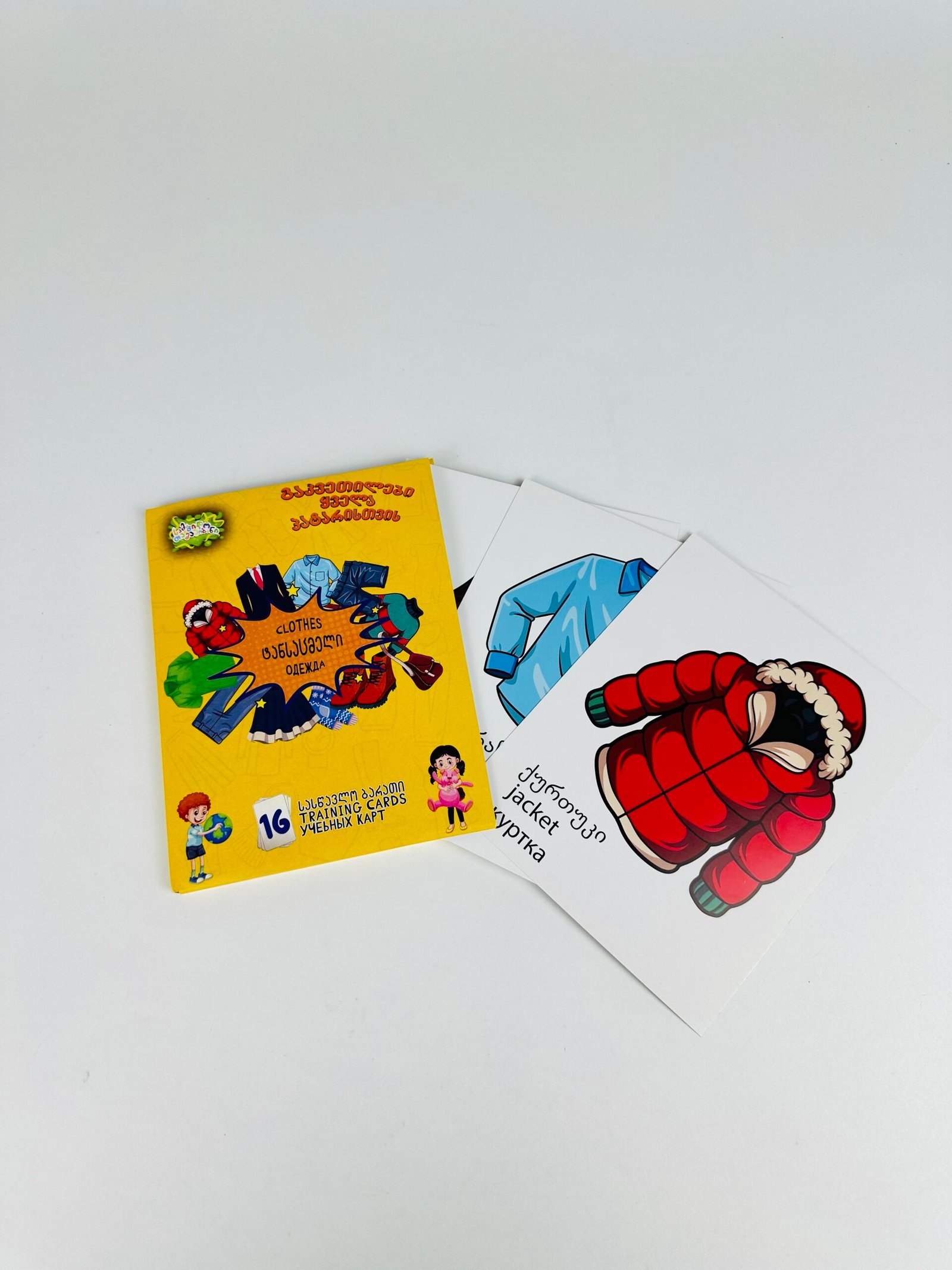 ტანსაცმელი – სასწავლო ბარათი არის მხიარული და შემეცნებითი ნაკრები, რომელიც ბავშვებს აცნობს სხვადასხვა ტიპის ტანსაცმელს, მათ სახელებსა და გამოყენებას. თითოეულ ბარათზე წარმოდგენილია ილუსტრაცია და ტანსაცმლის შესაბამისი დასახელება, რაც ხელს უწყობს ბავშვების სიტყვათა მარაგის გამდიდრებას და ყოველდღიური საგნების უკეთ გაცნობას.